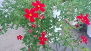 沢山のプランターを玄関先に並べ、いつも季節の花に囲まれているお宅、今朝も手入れに励んでおられました。 この酷暑にもめげず、目にもまぶしい煌めく赤色の花(花径は3cmほど)で、花の中心部の黄色との、コントラストが相乗効果で […]