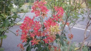 洋菓子店の入り口、生垣に植わった「ケラトペタルム」が、今年もだいぶ色着いて来ました。 この花は、切り花としてごく少量輸入されているようですが、この様に植木として栽培されているのを、目にする機会は殆ど無く、大変珍しいもので […]