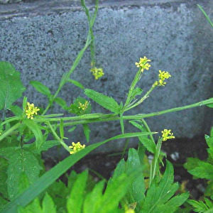 | 特徴 | アブラナ科では珍しい果実の付き方の注目! ヨーロッパ原産の帰化植物。黄色い花は小さく細長い果実も茎にぴったり沿って寝ているため目立たない。都会や住宅地の道端などでよく見られる。茎の下部にある葉は羽状の深い切れ込みがあり、上部の葉はT字形をしているのが特徴。 |