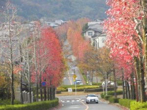 後半2枚は「桂坂 モミジバフウの並木道」、テレビの天気予報の一部で「紅葉した赤い龍」として紹介されたもので、ごく一部の地元の人しか知らない、知る人ぞ知る穴場の紅葉スポットとか。京大工学部の桂キャンパスの背後、京都西京区の高級住宅街で2キロに渡って伸びるモミジバフウの街路樹、坂の頂上から眺めれば、赤い龍が尻尾を振りまわしている様に見える様です。残念ながら、既に紅葉のピークは過ぎて、メインの部分は既に落葉してしまい枝だけで、僅かに龍の尻尾部分が残るだけの状態、しかも到着時は曇り空となり、物足りない写真に成って仕舞い、来年また仕切り直しです。