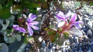 通常は夏前に花を咲かせるのですが、寒さ厳しいこの時期に、花を付けていました。この草花はキク科セネシオ属の多年草で、白銀色の産毛がビッシリ生えたシルバーリーフが魅力、和名では白妙菊(シロタエギク)と呼ばれます。初めて目にしたのは40余年前にアフリカ出張の時で、日本では全く目にした事が無い珍しい外見に驚きました。近年は日本の花壇で、主役を引き立てる役割で、根占めとして寄せ植えされているのを目にする機会が増えました。 つまりこの花をめでるのが目的でないので、シルバーリーフを成長させる為、蕾が出来る前に花茎を切除して、葉を育つように管理するのが一般的です。