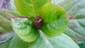 買い物途上にある花好きのお宅で、花壇の手入れ中の主婦から、冬咲きのアジサイ苗を貰って育てていると聞いたのが秋、そして「やっと蕾が付きました」と聞いて、撮影したのが12月25日(最初の写真)。