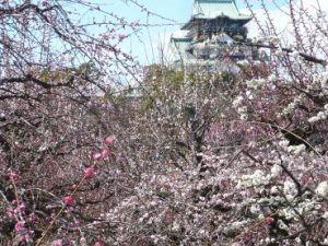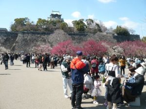 師走の気温が高く、年明け後は一転して厳しい寒波襲来した異常気象の為に、今年の梅の花の見頃は例年より一か月近く遅れていました。大阪城梅林は約1.7haの場所に、100種以上で1,000株以上の梅が植えられています。