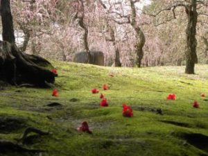 月光 、千羽鶴 、燕返し 等珍しい品種が多数、苔庭に映えるしだれ梅と落ち椿。