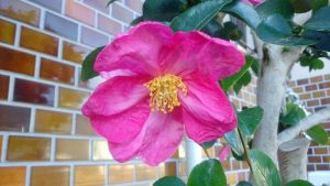 日課の早朝ウォーキングを終えた薄暗がりの中、ラジオ体操のBGMとして童謡「たき火」のメロディーが流れ、その歌詞「サザンカ サザンカ 咲いた道~♬」で、幼少時の情景が甦りました。成人してからの記憶はドンドン忘却の彼方への状態なのに、不思議なものです。咲く花の少ないこの時期の代表選手のサザンカは、ツバキ科ツバキ属の常緑広葉樹で11~12月が開花の時期、鉢植えや庭木で栽培しているのを目にする機会が多く、思いついて買い物ついでに、視野に入る花を撮影しました、