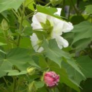 酔芙蓉の早朝の花色はみずみずしい白色(梅干しの様な紅色の物は